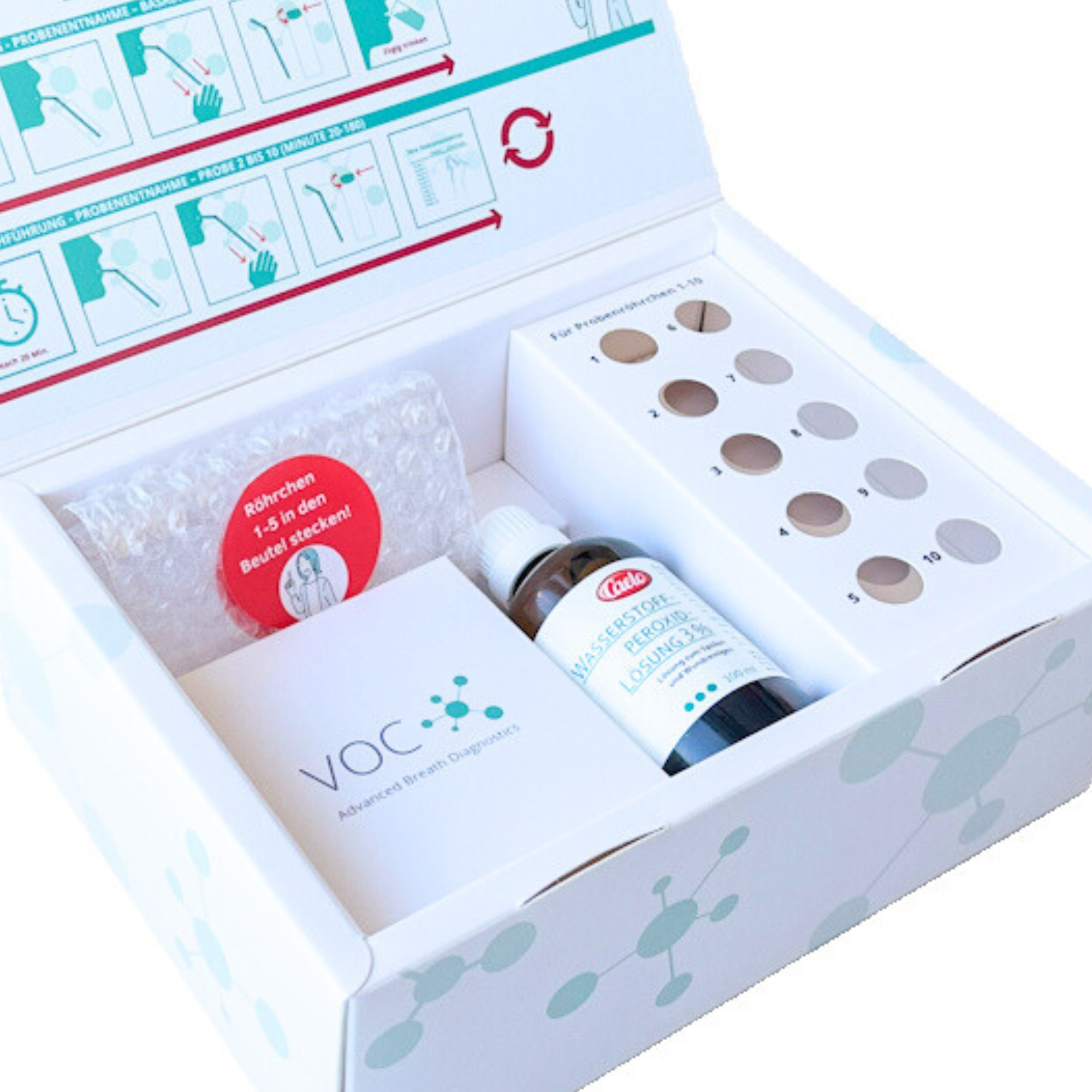 • Mit dem VOC-SIBO-Test erhalten Sie eine detaillierte Anleitung für die Vorbereitung auf den Test sowie die Testdurchführung. Die Testanleitung basiert auf den Empfehlungen europäischer und amerikanischer medizinsicher Leitlinien zur Testung auf SIBO. Bitte lesen Sie die Anleitung genau durch und befolgen Sie die Empfehlungen, da nur so ein verlässliches Testergebnis erzielt werden kann.