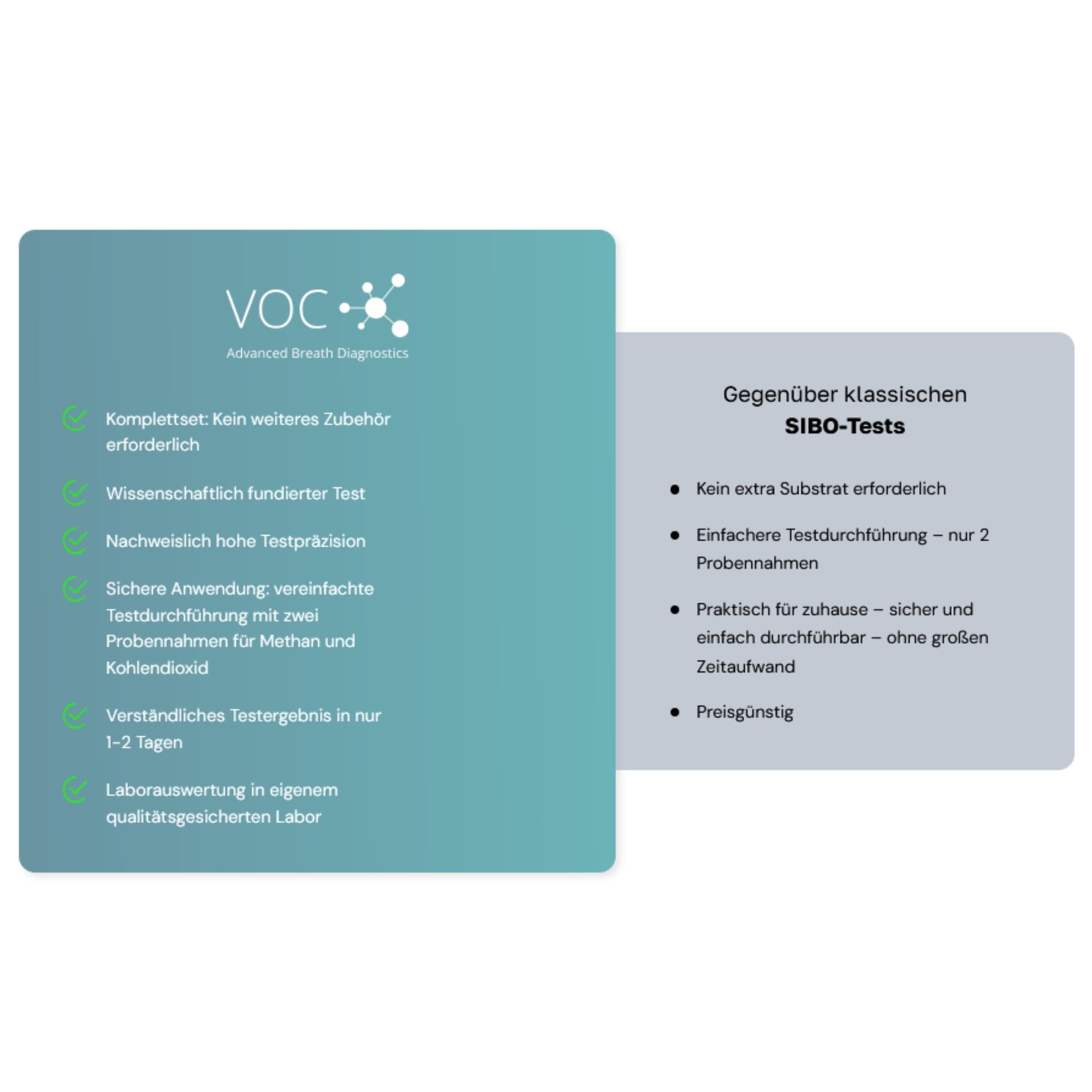- Mit dem VOC-IMO-Testkit erhalten Sie eine detaillierte Anleitung für die Vorbereitung auf den Test sowie die Testdurchführung. Die Testanleitung basiert auf den Empfehlungen europäischer und amerikanischer medizinsicher Leitlinien zur Testung auf SIBO. Bitte lesen Sie die Anleitung genau durch und befolgen Sie die Empfehlungen, da nur so ein verlässliches Testergebnis erzielt werden kann.