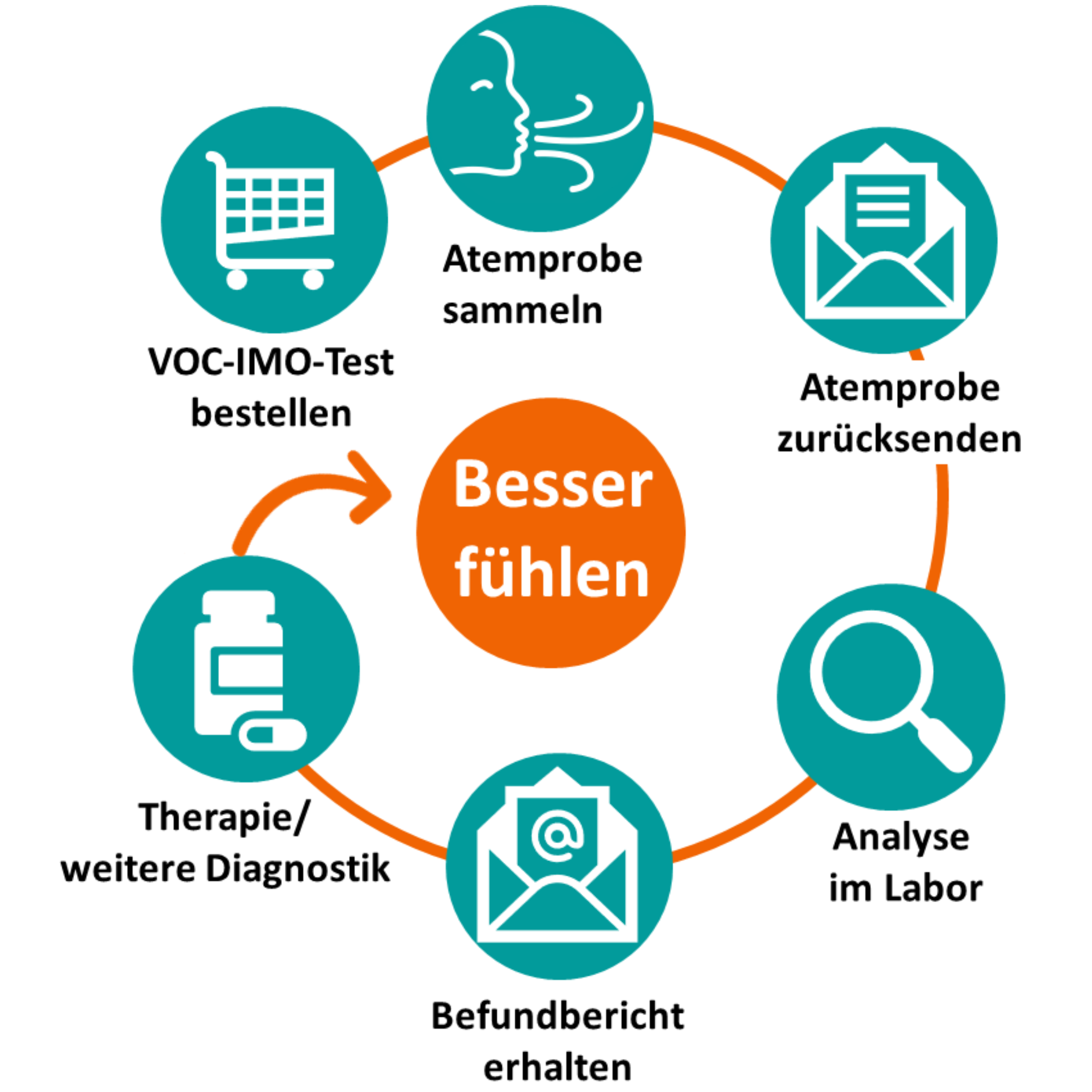 • Der VOC-IMO-Test misst mit einer speziell entwickelten Methode Methan und Kohlendioxid in einem Messvorgang. Dadurch wird eine besonders hohe Präzision der Atemanalyse erreicht.